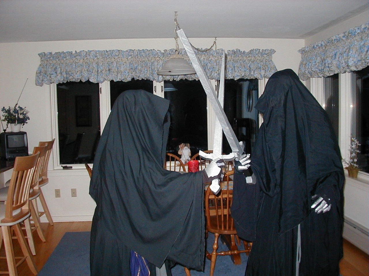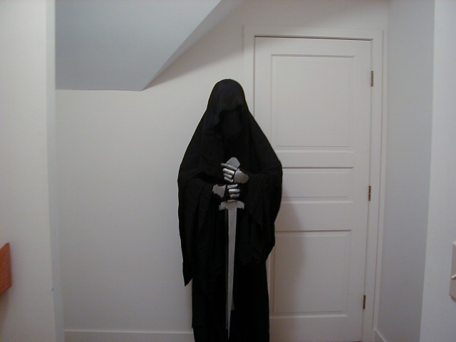 | I had my sister help me with this, and vice versa, which made it that much easier. This was a very easy costume to make, pretty much all we did was take 5 yards of our black fabric, fold it in half -it's now a square, and cut a hole at the top for our neck -basically, a poncho. Then, while I was wearing it, my sister helped me mark where I would cut the sleeves-seperating it from the fabric. Then I took it off, laid it out on my floor, and cut the sleeves evenly. Then I sewed them together, as well as sewing the sides closed almost all the way down. (we left it open a bit for horseback riding). We did NOT intend to make this costume "perfect", it was just a quickie thing for our film- shortcuts don't show on camera at night! For the "hood", we took the leftover 2 yd square and draped it over my head while I was wearing the visor. We marked how far in we'd attach the sheer fabric, then I took it off and sewed the sheer material to the hood. The gauntlets were the hardest part of this project. I would have LOVED to be able to make them out of real metal, or anything better than posterboard for that matter, but I was VERY restricted on money and time. So I made them out of silver posterboard, drawing each individual piece then first stapling-VERY bad idea- then taping and painting over it. Argh! This was sooo annoying and took awhile (a lot of my afternoon on Halloween!) They came out OK though. (Good enough for Halloween!) And lastly, I made shoe "covers" out of the silver posterboard to cover my sneakers. I attached them with silver shoelaces and...tape. Though they were made from posterboard, they looked kinda cool sticking out of my black robes :0) Accessories- using leftover black fabric and a silver shoelace (hee hee) I made a drawstring bag for Halloween that I could tie to my belt. This came in handy for small things like wallet, cell phone, and candy :0) Plus, it blended in with the black robes. :0) Our swords were the ones we made for our film out of wood. |