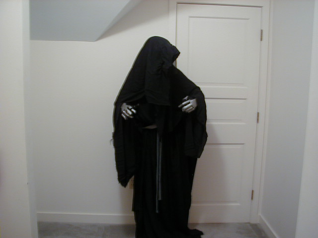 | One of the best things from LOTR to dress up as is ringwraiths. It's just sooo much fun! It's also soo annoying! So keep in mind if you're planning to dress up as one: The long robes to trip on, a hood that was completely annoying (lol) combined with the sheer piece of material that restricted my vision almost completely, and also made it harder to breathe with that stupid piece of fabric covering my whole face.... But it was all worth it :0) It's incredibly fun to be a ringwraith, one of the *scariest* creatures in middle earth. (Heh I should go as Sauron! THAT would be fun.) And after a bit I DID get used to the breathing-thing, and could see better. :0) Anyway, here's how we made our ringwraith costumes for our film (a quick, cheap, and easy way). We also wore them on Halloween. :0) |