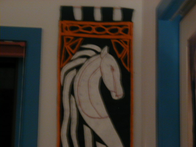 | I used felt for all the designs and the white horse. Due to time restraints (this was a last-minute gift!) I used fabric glue instead of sewing things on. It worked pretty well, but was such a hassle to work with! I DO NOT LIKE GLUE!!! lol. It took MANY washings to get that stuff off my hands after. ;0) The "design" on the horse was drawn with a brown fabric marker. It's really funny- getting the horse shape right was the hardest part for me! I can NOT draw horses (that's Lauren's strong point!). My first tries were pretty sad looking! LOL. Too bad I didn't take any pictures to post here.... Oh and in the future we plan on getting a better thing to hang it from. |