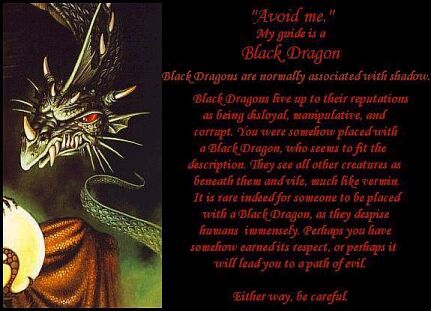 | In case you can't read it: Black Dragons are normally associated with shadow. Black Dragons live up to their reputations as being disloyal, manipulative, and corrupt. You were somehow placed with a Black Dragon, who seems to fit the description. they see all other creatures as beneath them and vile, much like vermin. It is rare indeed for someone to be placed with a Black Dragon, as they despise humans immensely. Perhaps you have somehow earned its respect, or perhaps it will lead you to a path of evil. Either way, be careful. (I'm not evil, really!) |