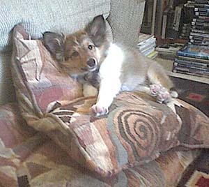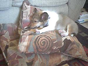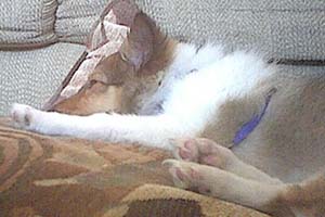 | Here's a picture of Howie when he's actually sleepy. He's pretty tolerable when he's sleepy, and I think his coat quite nicely complements the sofa pillows. |