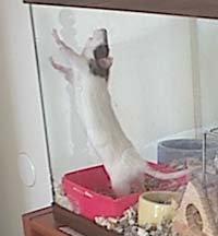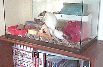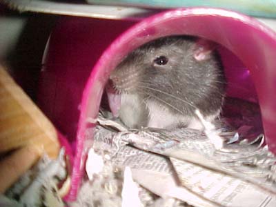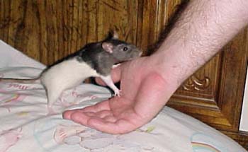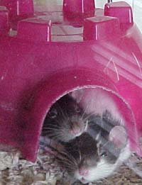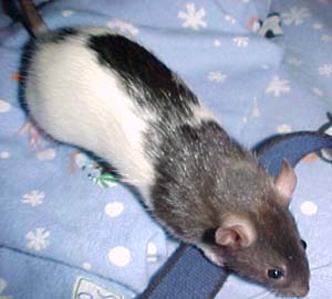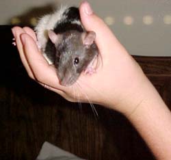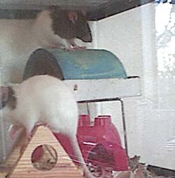 | Daisy and Zelda are two rambunctious rats who always provide me with some good afternoon entertainment. Zelda is the bigger rat who likes to pummel Daisy. You can remember very easily that Zelda is the wild one since she has a lightning bolt on her forehead. |