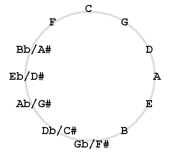 As you read around the circle in a clockwise direction, each new note is seperated from the previous note by an interval of a fifth. As you read around the circle in a counterclockwise direction, each new note is seperated from the previous note by an interval of a fourth.Most traditional music, and folk music in general, is not chromatic in nature, it is what we call diatonic....in other words it uses only 7 of the 12 divisions of the octave. This is the type of music for which the button box was concieved. The most common diatonic scale is the Major scale. It corresponds to the white keys on a piano.