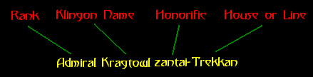 In most organizations, a Klingons name shows a lot about the individual. It can show their rank and status in the group and their family ties. The following is an example of a Klingon name and the label for each part of it. Each label will be described in greater detail further down.
