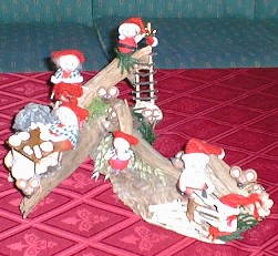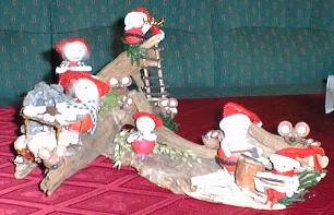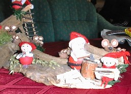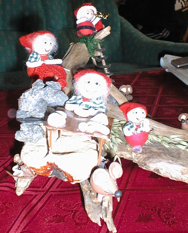 er av en malt papplate og tannpirkere. Stenovnen bak nissekonen som baker
