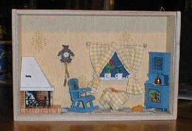 Selve kassen er kjøpt på IKEA. Der får man tak i billige kasser som er fine å lage små rom i. Desverre er de ikke så dype, men for enkle kasser er de flotte. Før jeg gjør noe som helst med kassen, setter jeg på oppheng bak. Disse kassene fra IKEA har et oppheng, men det kan lønne seg med to stykker da kassen kan få ulik vekt på begge sider. Som oppgeng kan man bare bruke vanlig billedoppheng som man spikrer på. Før jeg setter i gang og innrede kassen, limer jeg tapet på veggene. Tapet kan man få billig på enklete loppemarkeder, kanskje du har noen rester i kjelleren eller du kan få noen rester hos en malebutikk. For å lime tapeten på lønner det seg å bruke tapetlim. Dette tar litt tid å tørke, men sitter bedre på over tid. Gulvet i tittekassen kan males, men selv lot jeg dette være som det var, men la et lite teppe på gulvet. (Slike tepper får man kjøpt på Panduro.Både tapetbiter og gulvbelegg kan man få kjøpt på Panduro, men det koster litt ekstra.) Møblene som er brukt er gamle dokkehus-møbler fra jeg selv var barn. Slike møbler er dyrt om man skal kjøpe det nytt, men har man noe liggende er det kjekt å kunne bruke det. Har man ikke møbler tilgjengelig kan man få kjøpt det i leketøysbutikker eller i hobbybutikker. Selv fant jeg også et byggesett for møbler på Tier'n. Leter man litt kan man finne det billig, eller man kan selvsagt bruke kreativiteten å lage det selv. Gardinene er sydd av vanlig stoff. Gardinstangen er en blomsterpinne med to trekuler i hver ende. Denne er limt på en vindusramme fra et dukkehus jeg hadde. Bak vinduesrammen har jeg limt en papplate som jeg malte mørk blå. På denne platen kan man selvsagt male naturlige omgivelser, alt avhenger av hvor avansert man velger å gjøre det. Møblene limes