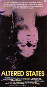 To explain the story, I'm going to quote the VHS cover pictured above. "Altered States is the mysterious, terrifying, incredible tale of Dr. Eddie Jessup, a research scientist who believes that other states of consciousness are as real as the everyday reality we all experience. First using sensory deprivation equipment, then adding powerful hallucinogenic drugs, he begins to explore these altered states . . . and endures experiences that make madness seem like a blessing."