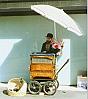 Paris street scene along the Champs Elysees with an organ grinder. |