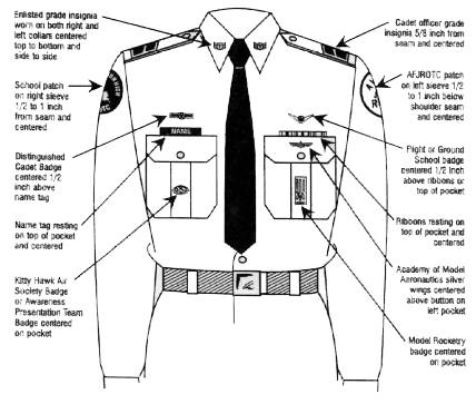 | AFJROTC patch on left sleeve 1/2 to 1 inch below shoulder seam and centered |