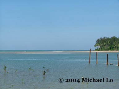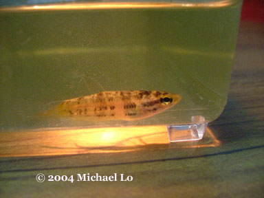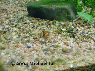| June 7th, 2004.My cousin and I started our fishing trip again. Before we reached the Lundu ferry point, we went to look for fish in the drain of oil palm plantation. We did not find anything interesting. Then, we moved forward to Sematan area. We found some swamps and small rivers which looks like the biotope of the wild betta but we still could not find the wild betta. Almost giving up hope, I found a strange looking rasbora species....and found out later its another variant of Sundadanio axelrodi. I also found another color variant of bumblebee goby. (Brachygobius doriae) Most of the rivers in Sematan are quite short and hence seeing different species of goby is very common. (30% of the rivers there are brackish water) |