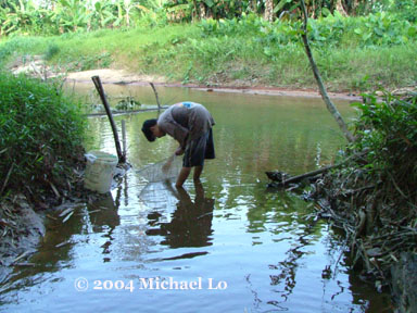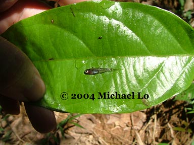 | June 18,2004. Today we're coming back to Sematan to collect Sundadanio axelrodi. I was not expecting to find any bettas. I thought the infomation which I found from the net could be inaccurate. It was not easy to collect those Sundadanio axelrodi as they are easily dead if we let them expose too much out of water surface! |