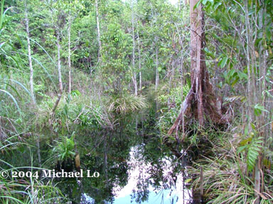 | When I saw the blackwater stream, my heart was pumping hard because this could be the homeland of wild betta. We went down to the stream, found Puntius hexazona, Rasborakalochroma and Rasbora pauciperforata. We moved into the deeper part of that area. There is no human settlement along the road in that remote area.....as seem we're in the no man land. At last we found a beautiful swamp, but still could not find the betta. We turned back home when the sky is getting dark. |