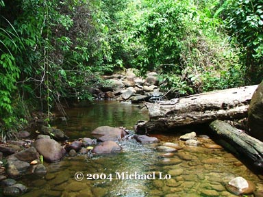 | July 12, 2004. I decided to go back to Sematan to find a "husband" for that female Betta sp. "Sematan". Zhou joined me this time. For the first half an hour, we failed to find any betta. We decided to go to the upper stream to search for the betta. We found two juveniles betta. Those young fish are not our target fish. We decided to split out and moved to different direction to search for adult fish. It rained half an hour later. It was a heavy rain. I could not find Zhou. I shouted his name so loud but still, I only could hear the sound of heavy rainfall....nothing else. I went back to the spot where we left our belonging. Waiting for the rain stop under the tree. After waiting for more than half an hour, there's still no sign of Zhou coming back to this spot. I was starting to worry that he could be lost in the tropical jungle or at worst, drown into the river. | |||||||||||||||||||||||