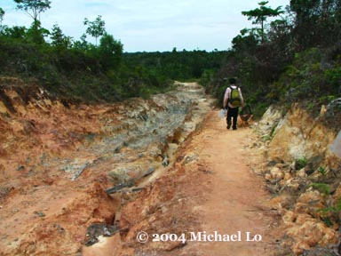 | July 14, 2004. This is our pay back time. My cousin was joining me and Zhou to explore the remote area of Sematan. After studying the Sematan map, we decided to explore another remote area of Sematan. This time we all have to hike as the road is too rough for my car to drive pass. Alas! This is the second day of hiking after coming back from the border of Kalimantan. My wounded left leg not fully recovered yet. | |||||||||||||||||||||||