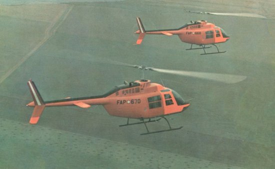 Comprados originalmente en 1971 para apoyar la búsqueda de petróleo en la Selva Peruana, los JetRanger cumplen hasta la actualidad una diversidad de funciones. En la foto los podemos ver con el esquema de pintura típico de los helicópteros de la FAP en los años '70.
