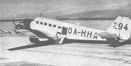>Aviones utilizados por la filial sudamericana de la línea alemana Lufthansa para sus vuelos locales; al inicio de la Segunda Guerra Mundial los pilotos alemanes fueron llamados de regreso para integrarse a la Luftwaffe, dejando en Lima dos Ju-52 que pasaron a engrosar el material del CAP. Se utilizaron principalmente para el transporte de carga en la Selva. En la foto de abajo podemos ver la llegada del primer Ju-52 de Lufthansa (nótese la matrícula peruana OA) a Limatambo, el 2 de abril de 1938; el 294 se convirtió en el "Husacarán".