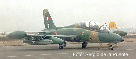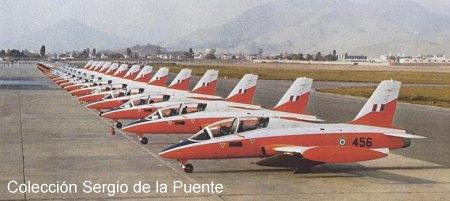 Desde su incorporación al Escuadrón 513 de la FAP en 1982, el Macchi cumple con las misiones de entrenamiento avanzado y de ser necesario puede efectuar apoyo táctico. Actualmente están volviendo a ser pintados con sus colores "escuela" originales. Foto de arriba: el 480 en pleno aterrizaje y a punto de tocar la rueda de nariz con el suelo. Foto de abajo: el total de aviones alineados en Las Palmas en los años 80; se pueden contar 14 colas, dos aviones ya se habían perdido casi apenas llegados al chocar mientras practicaban el "espejo" sobre Paracas.