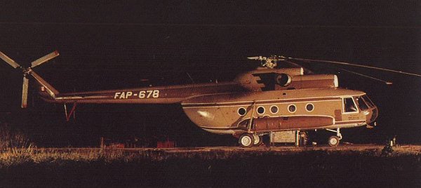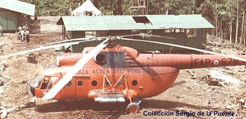 Un esquema de pintura nada común para un Mi-8T. Se trata de uno de los primeros ejemplares en servicio en la FAP, conservando los colores de soviéticos de Aeroflot. Posteriormente sería repintado rojo-naranja (ver foto de arriba).