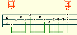 簡易六線譜是以chord為基礎的結他譜, 以撥奏(掃chord)為主, 彈奏(finger picking)為次, 以下是一個簡易六線譜: