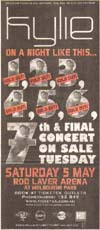 | SETLIST KM Overture / Loveboat / KooKachoo / Hand On Your Heart / Put Yourself In My Place / On A Night Like This / Medley: Step Back In Time / Never Too Late - Would'nt Change A Thing - Turn It Into Love - Celebration / Can't Get You Out Of My Head / Your Disco Needs You / I Should Be So Lucky (Acoustic) / Better The Devil You Know (Broadway) So Now Goodbye / Physical / Butterfly / Confide In Me Kids / Shocked / Light Years / What Do I Have To Do? ENCORE - Spinning Around (Did It Again) was added for the Brisbane dates) |