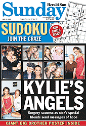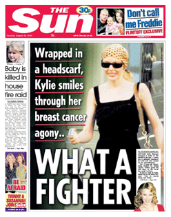 | KYLIES LAW The Newspapers have been full of coverage regarding Kylie's treatment for breast cancer in Paris since June. News of operations and chemotherapy along with the public pictures of her hairloss covered by scarf. It is all at times hard to see the wonderful woman battling through a disease which does not discriminate. There is though positive news, Kylie's dignity has helped rise the amount of checks for woman under 40 by up to 40% in the Uk and Australia. There is now a swift law due to be passed to reduce the mandatory screening age from 50 to 30. Kylie decided to release a superb dvd of the Showgirl tour - She is fighting to be back on stage by November 2006 and with an updated package for her home audiences - who failed to see the tour due to the cancer affliction. Minogue stunned by reaction and appreciates support.. Kylie has expressed her greatest thanks to the support and message of love she has received. This has been quite a shock for everyone. Kylie had used her image and beauty for so many years, her down to earth nature and iconic status has added to the fragile nature and the vulnerabiulity of everyone to this disease. "My heartfelt thanks to the incredible number of people who have sent messages of love and support over the last two days. I want to reassure you that I am being well taken care of. Olivier is by my side abd I have alot of family and friends around me. I would also like to extend mybest wishes to all of the other women around Australia and around the World who are dealing with the same illness." Dannii, Brendan, Ron and Carol are all there with Kylie. Dannii has also expressed her thanks to the fans and the messages she has received regarding her big sister, its quite overwhleming how the news has been hrough out the World and in the entertainment industry the shock has been widely publicised. From Madonna to Coldplay to Elton to her fans who have recently seen the Showgirl tour in Europe. If you use the link on the pink Kylie K (top left of this page) the official donation page for Kylie cancer charity ..dig deep cancer does not discriminate! |