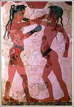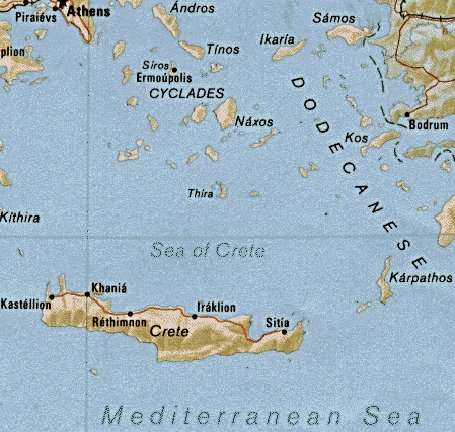Crete ซึ่งอยู่ไกลกันถึง 96 กิโลเมตร ดังนั้น ในปี พ.ศ. 2482 Marinators จึงได้เสนอความคิดว่า อารยธรรม Minoan บนเกาะ Crete ต้องล่มสลาย เพราะได้เกิดการระเบิดครั้งยิ่งใหญ่ ของภูเขาไฟ บนเกาะ Thera (ซึ่งปัจจุบันเรียกเกาะ Santorini) เหตุการณ์แผ่นดินไหวอย่างรุนแรงในครั้งนั้นได้ทำให้พระราชวัง Knossos และเมืองต่างๆ ของอาณาจักร Minoan พังทลาย และเถ้าถ่านและฝุ่นละอองจากภูเขาไฟได้ถล่มถมทับสิ่งปรักหักพังเหล่านี้จนหมดสิ้น เมื่อ Marinatos ได้ขุดพบหลักฐานทาง โบราณคดีที่สนับสนุนความคิดนี้ ที่เมือง Akrotiri ซึ่งอยู่ทางใต้ของเกาะ Thera เขาก็ได้พบถนนหนทาง เครื่องใช้ เช่น เครื่องปั้นดินเผามากมาย ซึ่งแสดงให้เห็นว่า Akrotiri ก็เคยเป็นดินแดนหนึ่งของอารยธรรม Minoan บนเกาะ Crete เช่นกัน