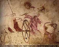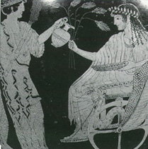 วันหนึ่งเจ้าแม่ดีมิเตอร์พเนจรเลียบฝั่งแม่น้ำอยู่ พลันได้ประสบวัตถุแวววาวสิ่งหนึ่งอยู่แทบบาท เจ้าแม่จำได้ ทันทีว่าเป็นวายรัดองค์ของธิดา คือสายรัดองค์ที่เพอร์เซโฟนีทิ้งฝากนางอัปสรแห่งแม่น้ำไซเอนีไว้ เมื่อตอนรถทรงของฮาเดส จะลงสู่บาดาล เจ้าแม่ได้ของสิ่งนี้ยินดียิ่งนัก แสดงว่าธิดาอยู่ใกล้ที่นั้น จึงรีบดำเนินไปจนถึงน้ำพุแก้วแห่งหนึ่ง รู้สึกเมื่อยล้า จึงลงพักทอดองค์ตามสบาย พอรู้สึกเคลิ้มจะหลับ เสียงน้ำพุก็ฟ่องเฟื่องยิ่งขึ้นเหมือนเสียงพูดพึมพำ ในที่สุดเจ้าแม่ก็จับความ ได้ว่า เป็นความประวัติของตนให้เจ้าแม่สดับฟัง และต้องการจะแจ้งข่าวของธิดาเจ้าแม่ว่าเป็นประการใด น้ำพุเล่าประวัติของ ตนเองว่า เดิมตนเป็นนางอัปสรขื่อว่า แอรีธูสะ (Arethusa) บริวารของเทวี อาร์เตมิส (Artemis) วันหนึ่งลง อาบน้ำในแม่น้ำ แอลฟีอัส (Alpheus) เทพประจำน่านน้ำนั้นหลงรัก แต่นางไม่ไยดีด้วยจึงหนีไป ส่วนเทพนั้นก็ ติดตามไม่ลดละ นางหนีเตลิดข้ามเขาไปตลอดแว่นแคว้น ซ้ำผ่านแดนบาดาลไปตลอดอาณาเขตของฮาเดส ได้เห็น เพอร์เซโฟนีประทับบัลลังก์อาสน์อยู่ในที่ราชินีแห่งยมโลก ครั้นกลับขึ้นมาอ่อนแรงเห็นไม่พ้นเทพแอลฟีอัส นางเสี่ยงบุญ อธิษฐานยึดเอาเจ้าแม่ของนางเป็นที่พึ่ง เทวีเดียนาจึงโปรดบันดาลให้นางกลายเป็นน้ำพุอยู่ ณ ที่นั่น