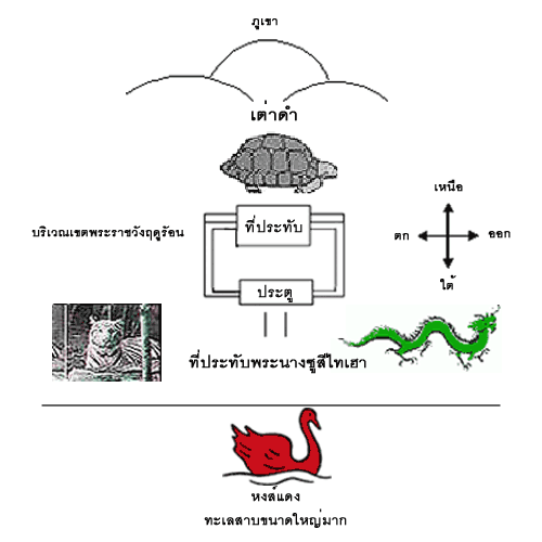ทิศใต้ คือ หงส์แดง หมายถึง น้ำ สายน้ำ และมีพื้นที่โล่งเหมาะแก่การเพาะปลูก ทิศใต้นี้แสดงถึงความอุดมสมบูรณ์ (น้ำ) ความอบอุ่น ความสุข ความรุ่งเรือง