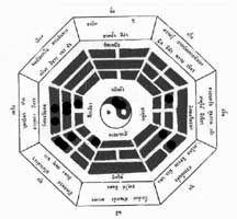 แนวความคิดเรื่องทิศทั้ง 8 นี้มาจากความเชื่อเรื่องจักรวาล เรื่องเทพวัตถุบนฟ้าว่าเคลื่อนที่ตามกฎหรือตัวเลขที่แน่นอน สวรรค์ โลก มนุษย์ ธรรมชาติย่อมมีความ เชื่อมโยงซึ่งกันและกัน เชื่อกันว่าธรรมชาติกำหนดทิศ ฟ้าดินกำหนดคุณสมบัติของทิศ ความสัมพันธ์เกี่ยวข้องกับหยินและหยาง และเขียนออกเป็นสัญลักษณ์ คือ หยางแทนด้วยเส้นเต็มเส้นหนึ่ง (---- ) หยินแทนด้วยเส้นประ (- -) สองเส้นเมื่อนำมาประกบกัน (หยินและหยาง) จะกลายเป็นรูปสามเหลี่ยม ซึ่งมีความหมายว่า ธรรมชาติกำเนิดทิศ ฟ้าดินกำหนดคุณสมบัติของทิศ ดังที่แสดงทิศทั้ง 8 ไว้ดังนี้ (ละเอียด ศิลาน้อย 2530:32)