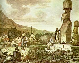 ครั้นเมื่อถึงยามอรุโณทัย ลูกเรือชาวดัทช์ต้องประหลาดใจเป็นอย่างมากกับภาพที่พวกเขาได้เห็น เพราะตลอดความยาวของชายฝั่ง ผู้คนผิวสีต่างๆกันกำลังทำพิธีสักการะและบวงสรวงรูปสลักหินขนาดใหญ่ที่ตั้งอยู่เบื้องหน้า