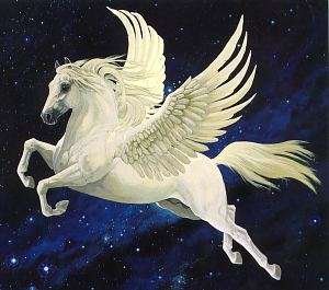ประวัติขฃอเพกาซัสตัวนี้ค่อนข้างจะน่าขนลุกอยู่สักหน่อย เรื่องเริ่มมาจากนางกอร์กอน เมดูซ่า นางคนนี้มีความร้ายกาจมากแต่ก็ถูกวีรบุรุษ เปอร์ซีอุล ฟันคอขาดตาย ในขณะที่ นางสิ้นใจตายนั้น มีร่างของม้ากำยำพ่วงพี พร้อมด้วยปีกอันกว้างสง่างาม กระโจนออกมา จากลำคอของนาง ม้าตัวนั้นก็คือ เพกาซัส นั่นเอง เมื่อออกมาแล้วมันก็แผลงฤทธิ์ จนไม่มีใครสามารถปราบได้เลยซักคน ทั้งที่เพกาซัสเป็นความหวัง ของคนทั้งเมือง นอกจากความเก่งกล้าในฝีตีนและฝีปีกแล้ว เพกาซัสยังมีควาสมารถอีกอย่าง คือตอนที่มันเกิดมาใหม่ๆ และออกวิ่งอย่างคึกคนอง นั้น น้ำที่กระเซ็นจากรอยเท้า ที่มันวิ่ง ก่อให้เกิดน้ำพุสวยงาม ที่กวีและศิลปินชื่นชมกันนักหนา คือน้ำพุ ฮิปโปครีนี (Hippocrene) ที่เป็นที่รู้จักกันในวรรณคดกรีกโบราณ ว่ากันว่า ใครได้ดื่มน้ำพุนี้แล้ว โอกาสที่จะเป็นกวีเอกอยู่แค่เอื้อมที่เดียว เพกาซัสคึกอยู่ ได้ไม่นาน ก็มีคนดีมาปราบ เป็นเด็กหนุ่มรูปหล่อชาวเมืองโครินทร์มีนามว่า "เบลเลอโรฟอน (Bellerophon)