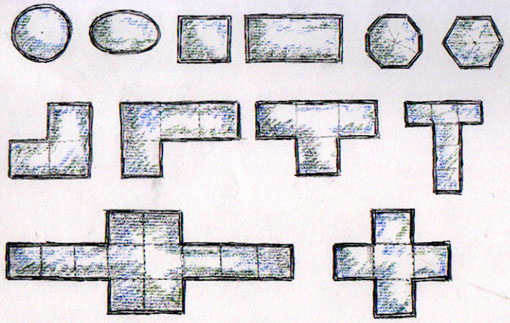 alargados que quedan muy lindos- , octagonales, hexagonales... Tambien pueden ser combinaciones de formas simples: En "L", en "L" con un brazo mas largo, en "T", en "T" con un brazo mas largo... Hay miles de combinaciones posibles...en cruz con brazos largos, en cruz simple... Tambien se pueden combinar circulos con cuadrados...por ejemplo un rectangulo con las dos puntas en semicirculo...o como en el dibujo de abajo, un semicirculo con un cuadrado que es la tercera parte de su diametro... They can be simple geometrical shapes: Round, oval, square,