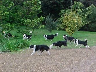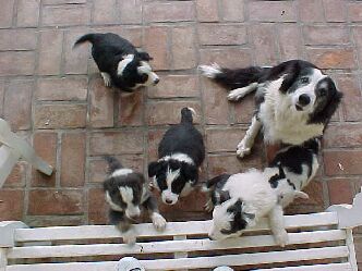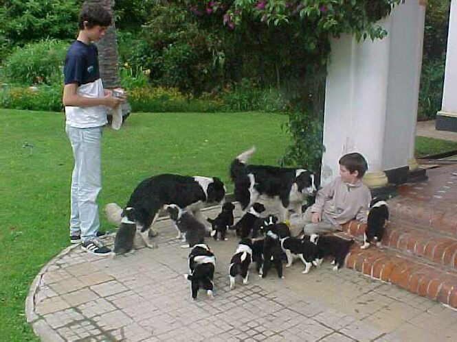 Ruperto y Rufino. En nuestra familia siempre se habia criado esta raza, son realmente muy inteligentes -entienden todo-, compaņeros, muy obedientes, cariņosos y muy utiles para trabajar en el campo. (Sobre todo con ovejas o hacienda, con los caballos es increible como aprenden a no molestarlos). Tambien son muy buenos con los chicos y los acompaņan y cuidan. Los primeros que tuvimos fueron Tip (colorado) y Morita (negra). A lo largo de los aņos hemos ido agregando nuevos reproductores machos de otras lineas de sangre (Paco, Jack, etc ). Por aņo nacen mas de 20 cachorros (generalmente hay unas tres perras en produccion), normalmente los regalamos a todos...en la zona que vivimos se ven Border Collies por todos lados... |