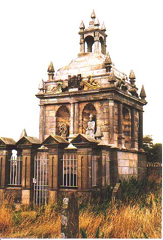 | left: This photograph by Tommy Moore of Grey Mare's Hill, has the old church of St. Andrew's in the far distance. The church- yard contains the Hop- per Mausoleum (right) Built by the Hopper family of Black Hedley in Northumberland, in 1752 |