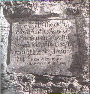 | under a tree at Wharnley Burn Farm. In 1866, his headstone was removed and set into a farmhouse wall near Satley. |
