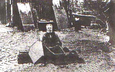 | 'The old man of the woods' Tommy Thompson, sitting reading the bible in 'his' coffin. Nearby is the shelter he erected in the woods near Allansford |