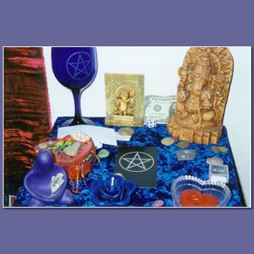 On the blue velvet altar cloth is salt, crystals, several Ganesha statues, candles, and my chalice.