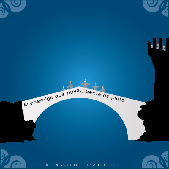 A enemigo que huye, puente de plata.Significado: Siempre es preferible evitar los conflictos y no solo eso sino tambi�n a facilitar la salida de quienes nos estorban o nos molestan en nuestro d�a a d�a. Dentro de la literatura podemos encontrar una variaci�n de este refr�n, mas precisamente en �El Quijote� (parte II , capitulo LVIII). Tambi�n Lope de vega lo utiliza en su obra �La estrella de Sevilla� de la siguiente manera: �Que al enemigo se ha de hacer puente de plata�. |