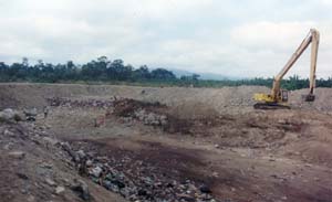 Se halla en las riberas del río Bucay a pocos metros del sitio donde se había vuelto tradición la instalación de una cabaña en la temporada carnavalera, entrando desde la Panamericana a pocas cuadras de la Iglesia del barrio San Jacinto. Nuevo recolector Así mismo, para optimizar la recolección de la basura el Gobierno Municipal ha adquirido un vehículo nuevo al cual se acondicionará el “balde” de un recolector viejo que ha sido reparado en sus sistema hidráulico. De esta forma se espera cumplir un mejor trabajo en la limpieza de la ciudad. ¿Qué pasó con el antiguo botadero? Los terrenos en que hasta hace poco se depositaba la basura de Naranjal son de propiedad de don Arturo Quirola, con quien durante los dos últimos meses se había contratado para que fuera enterrada a un costo de 6.000 dólares mensuales; pero, al haber conseguido gratuitamente por el tiempo señalado un nuevo sitio para ser utilizado como botadero, se ha prescindido de dicho contrato ahorrando la caja municipal el pago citado. a pocos metros de este sitio, a orillas del río Bucay, se halla el nuevo botadero municipal |