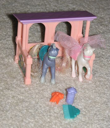 | Mid '90's Vintage Littlest Pet Shop Baby Pony Pairs. Comes with blue boy pony, pink girl pony, green saddle, pink saddle with lace, orange bunch of carrots, purple bottle, green hair brush, and peach stable with purple rook. Stickers may be peeling off on corners. They have magnets in their noses so they can nuzzle. Played with care. |