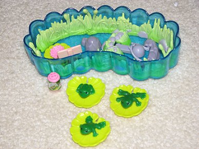 | Mid '90's Vintage Littlest Pet Shop Leap Frogs. Comes with 3 dark green frogs on light green lily pads, blue transparent tank with swampy habitat inside, plasitic terrain, and pink food container. frogs can be launched from tank. Played with Care! |