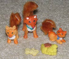 | Mid '90's Vintage Littlest Pet Shop Fox Family. Comes with Mommy fox and two baby foxes, hollow log house on grass, yellow butterfly, and yellow food dish. Mommy fox has moving head, and one baby fox has moving ears. Butterfly has magnet. Played with Care! |