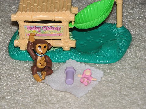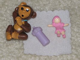 | Mid '90's Vintage Littlest Pet Shop Baby Chimp. Comes with Baby Chimp, yellow bamboo house on grass, leafy hammock, bunch of yellow banana, pink baby doll, white fuzzy blanket, and lavender bottle that you can squeeze. monkey can suck his thump. Played with Care! |