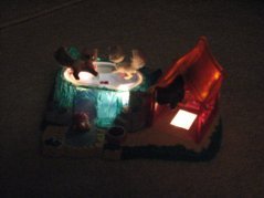 | Mid '90's Vintage Littlest Pet Shop Water Garden Kitties. Comes with Dark brown cat, Light gray cat, White and brown siamese cat, orange and pink turtle, plastic pond and grass platform, transparent red house with yellow roof, and round pearlized pink food dish. Cat chases pond flower pedals pond habitat lights up, brown cat waves tail when head is pressed down, turtle slides down tunnel under pond. *there is a small scratch in the surface of the pond* Batteries not included. Played with Care! |