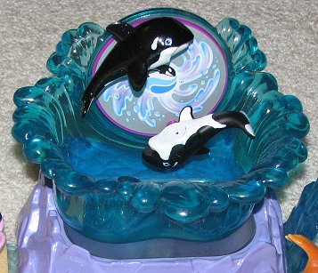 Mid '90's Littlest Pet Shop Shamu and Friends. Contains 5 miniture habitats includingAnimals include Papa Shamu, Mama Shamu, Baby Shamu, Dolly Dolphin, Sir Winston Walrus, Pete and Polly Penguin, and Shamu Whale. Also come with cute mini friends such as Sea Otter, Pink Squid ( not pictures), Orange Snail, and Red Crab. Papa Shamu opens mouth when you push his fin. Dolly Dolphin Spins on her habitat. Water areas are all transparent. Each comes with a container of fish. Shamu stage has diving wheel and wather slide on a rocky purple platform that lights up from the bottom. Used but Played with Care! |