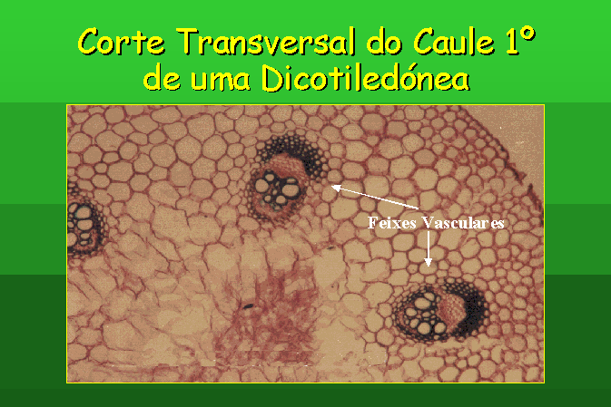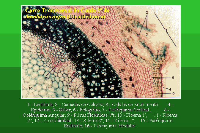 dicotiledónea pode ser estudada, por exemplo, no corte transversal do caule de Sambucus
