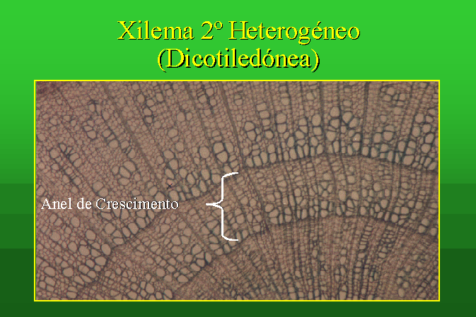 O xilema secundário apresenta-se aqui, ao contrário do que se passa nas gimnospérmicas, com células de diferentes calibres, ou seja trata-se de um xilema heterogéneo.