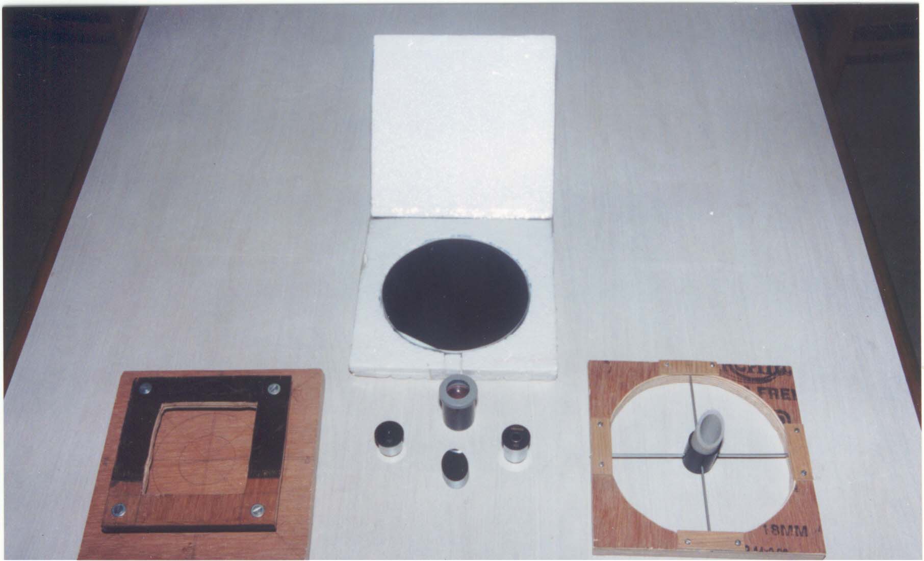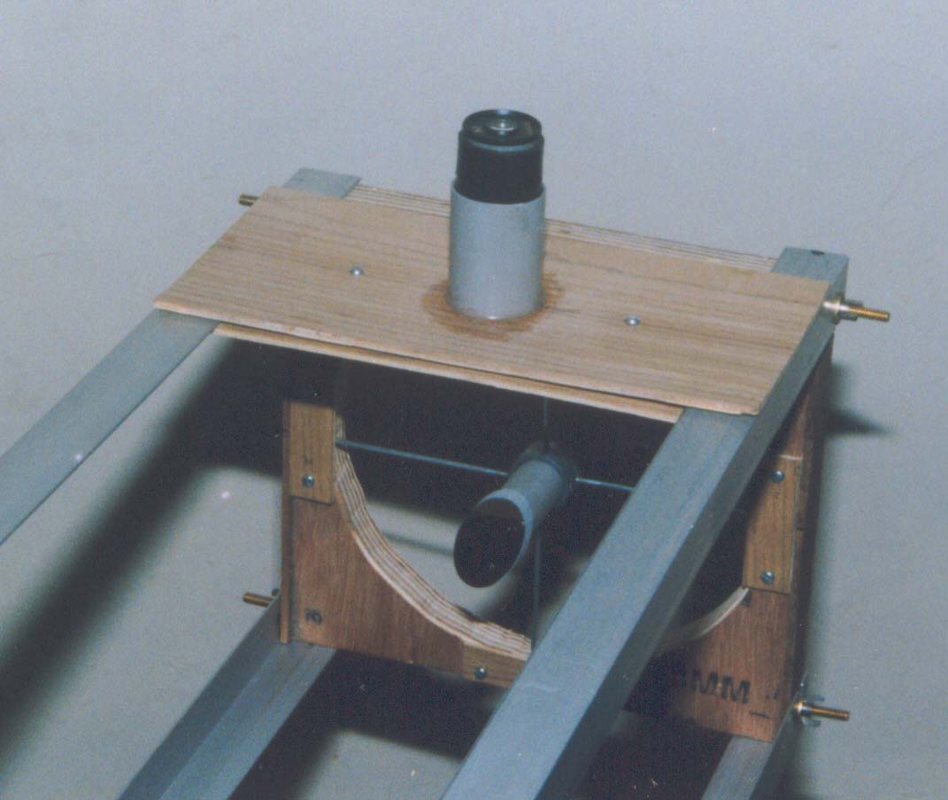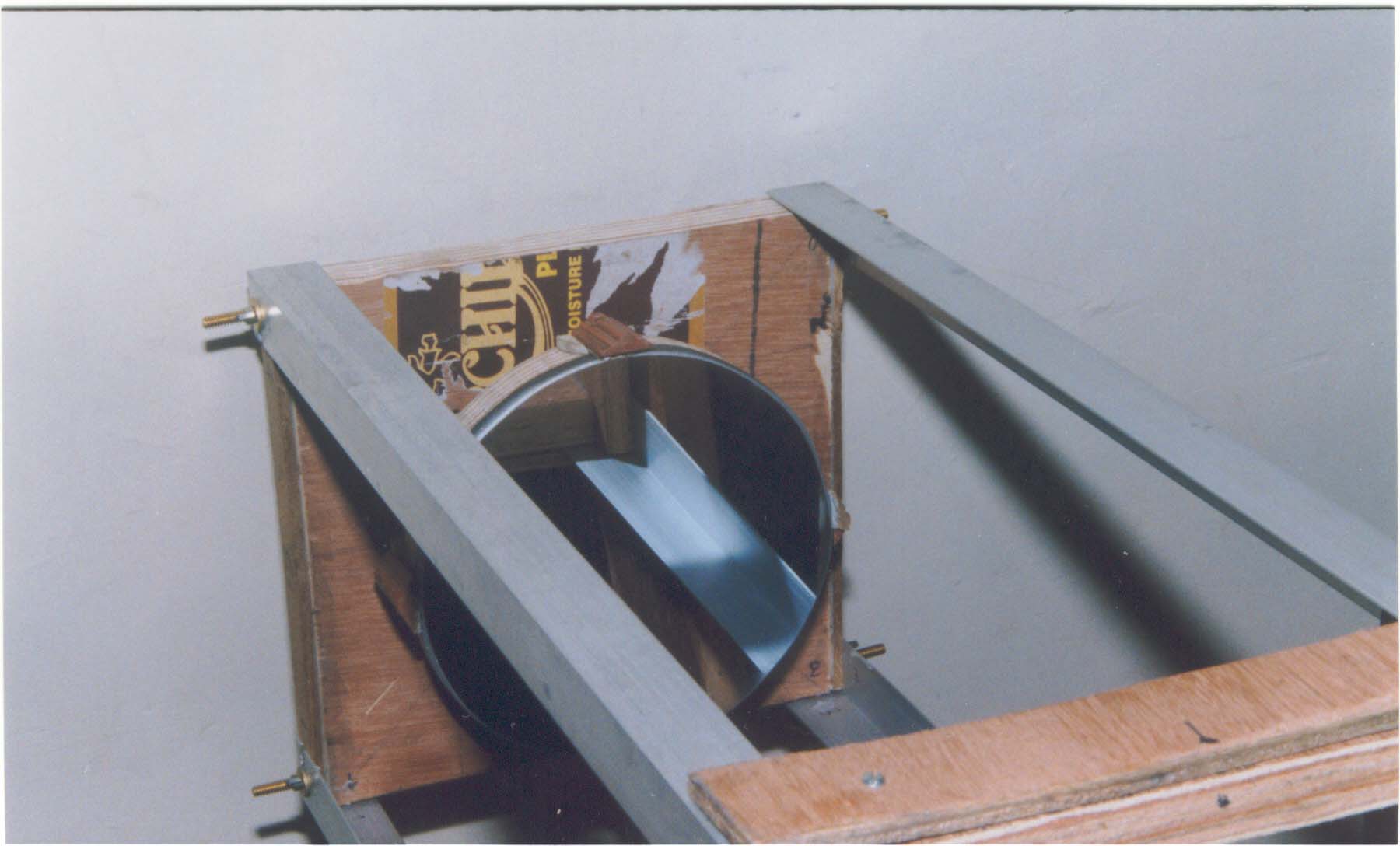The mirror mount end, with the mirror attached. You can see the reflection of one of the aluminium angles. The manufacturer's label can be seen stuck to the plywood behind the mirror. All the inner facing surfaces have since been painted black. A tube made of black cardboard covers the mirror and extends halfway down the frame.