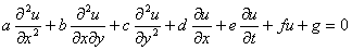 If the equation is separable, the second term is absent. a, b, c, d, e, f, g, are coefficients which may be constant, dependent on x and y and (horrors!) possibly on u also, in which case the PDE becomes a non-linear nightmare.