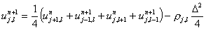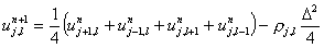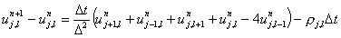 Thus we can get a new value of u at step (n+1) using the four surrounding old values at step n and the source term. The procedure is to sweep through the points starting from one comer row by row and calculate a new value for u using the formula above at each point. This is repeated till some predeterminimaed accuracy is attained.